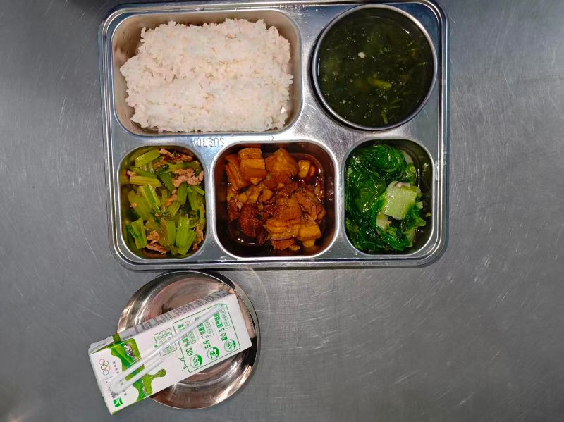 套餐A:红烧肉圆、芹菜牛肉丝、菌菇白菜、荠菜豆腐羹、粳米饭、学生奶1盒