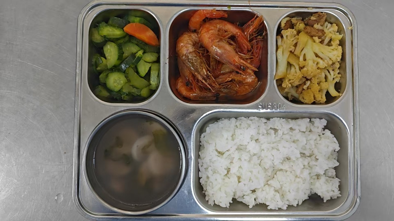 套餐B:椒盐基围虾、花菜肉片、胡萝卜黄瓜片、紫菜贡丸汤、粳米饭