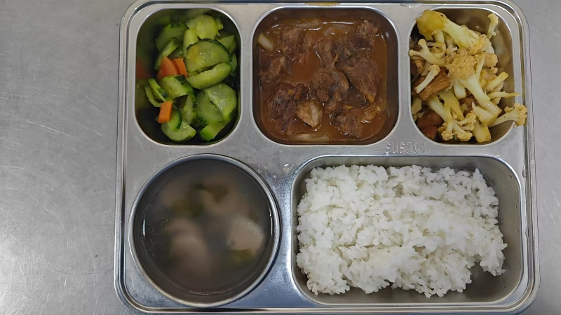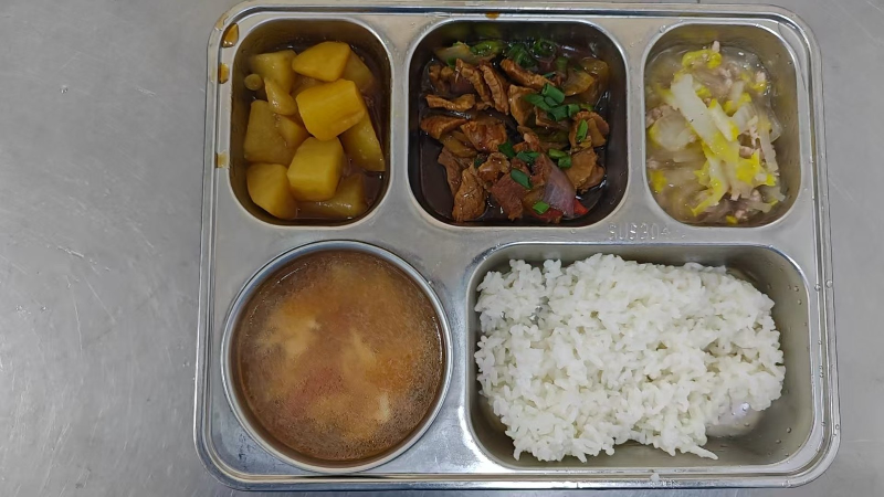 套餐A:洋葱番茄牛腩、花菜肉片、胡萝卜黄瓜片、紫菜贡丸汤、粳米饭