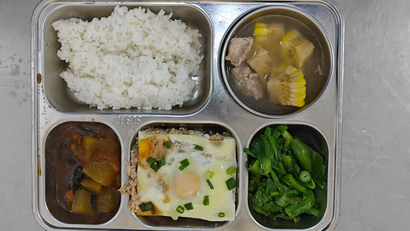 套餐A:肉末蒸蛋、红烧冬瓜肉丝、炒菜苋、玉米小排汤、粳米饭