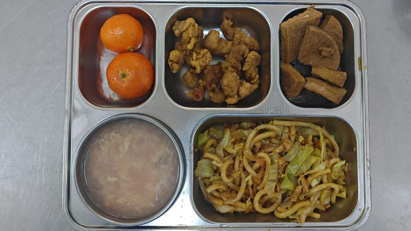 套餐A:椒盐小酥肉、火腿鸡蛋豆腐羹、卤素鸡、乌冬炒面、砂糖橘2只