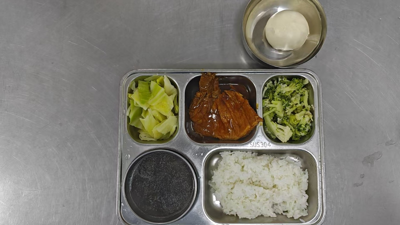 套餐B:红烧大排、双色花菜肉片、炒卷心菜、紫菜牛肉丸汤、粳米饭、奶黄包一只