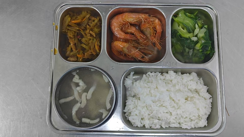 套餐A:椒盐基围虾、鱼香莴笋肉丝、炒青菜、咸肉竹笋汤、粳米饭