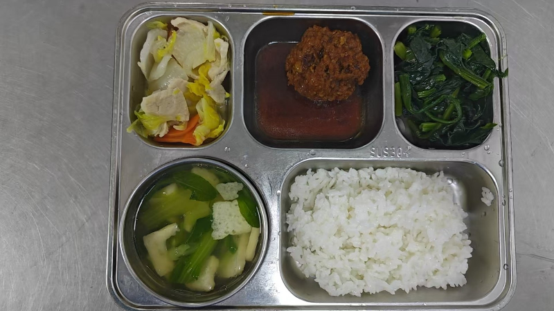 套餐A:红烧狮子头、上汤娃娃菜、炒菠菜、毛菜油泡汤、杂粮饭