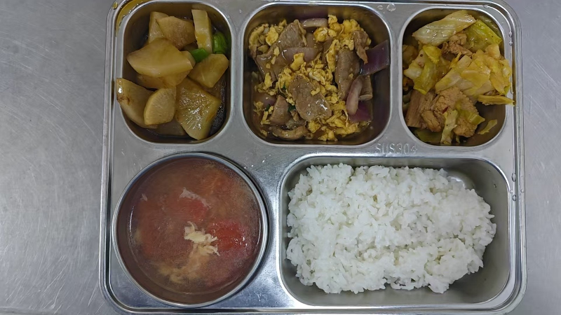 套餐A:滑蛋牛肉、回锅肉片、油焖萝卜、番茄蛋汤、粳米饭