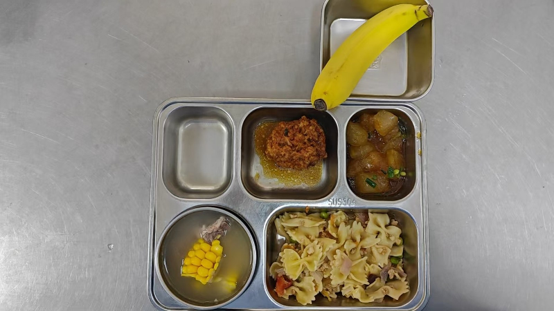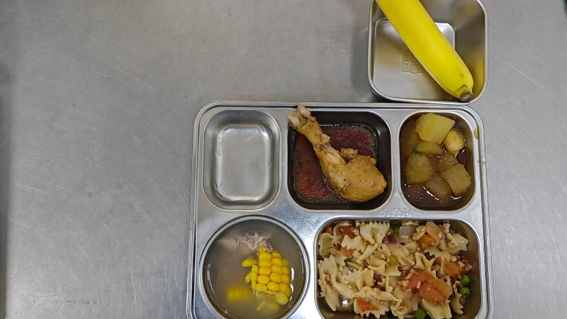 套餐A:蒸盐水鸡腿、红烧冬瓜、玉米小排汤、肉酱意式面、香蕉1只