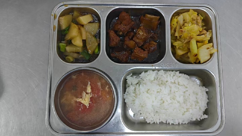 套餐B:番茄玉米蒸鱼块、鱼香莴笋肉丝、炒青菜、咸肉竹笋汤、粳米饭