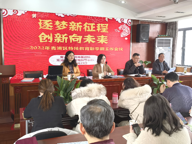 2月23日下午,青浦区在区特教指导中心召开了以“逐梦新征程 创新向未来”为主题的2022年特殊教育工作会议。教育局基教科分管特殊教育的刘丽君老师、中心常务副主任、辅读学校校长陈建军老师及区特教教研员钱慧红老师出席。全区各九年一贯制学校、初中、小学及幼儿园的特教分管领导、特教学校教导主任及中心巡回指导教师等近70人参加会议。