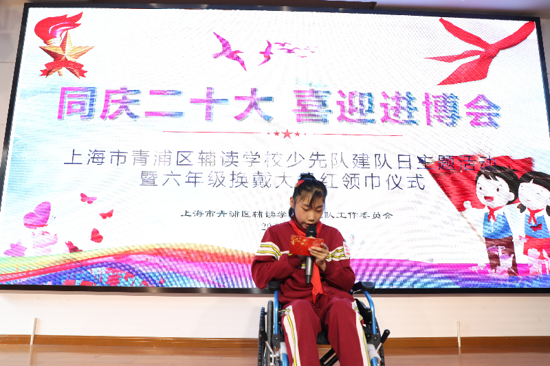 为庆祝党的二十大胜利召开,庆祝少先队建队73周年,进一步继承和弘扬中国少年先锋队的光荣传统,青浦区辅读学校于10月20日举行了“同庆二十大 喜迎进博会”少先队建队日主题活动暨六年级换戴大号红领巾仪式。