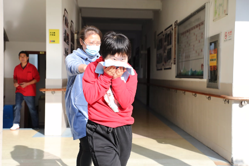我校许丽英老师向师生以《消防记心间 安全伴一生》作国旗下讲话,介绍此次消防疏散演练的安全注意事项。此次活动预设场景为学校教学楼作业治疗康复室因电线短路从而引发火灾,烟气逐步向二楼楼道蔓延。全校师生在听到“起火了”的警报声后,从设定的撤离路线进行紧急疏散。学生在班主任与保育员老师的带领下,做好防护有序撤离。全体教师在疏散的同时协助学生撤离,充分保障学生安全。