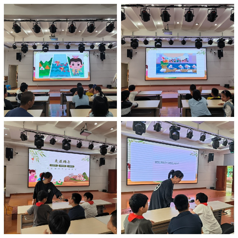 活动伊始,主持人魏雨茜老师以生动有趣的语言讲述端午节的起源,结合动画视频呈现“屈原投江”“曹娥救父”等经典故事,带领学生追溯端午历史,了解这一传统节日承载的爱国精神与孝道文化。师生互动环节中,孩子们踊跃发言,在轻松的氛围中加深了对端午文化内涵的理解。